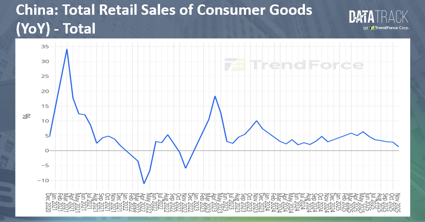 In November 2025, China’s total retail sales of consumer goods reached approximately RMB 4.39 trillion, up about 1.3% year on year. The growth rate came in well below the market’s prior expectation of nearly 3% and declined further from October, remaining near the lowest range since December 2022. Compared with the roughly 3% year-on-year growth recorded in November 2024, the pace has weakened markedly, underscoring the continued softness in the recovery of domestic demand. On a cumulative basis, retail sales grew by about 4% in the January–November period, slower than the near-5% pace seen in the first half of the year, indicating a cooling in consumer confidence and actual spending since the third quarter.