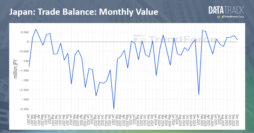 Overall, Japan’s trade surplus in December 2025 remained positive but narrowed significantly, reflecting the combined effects of moderating export growth momentum and strengthening import demand. Supported by stimulus measures under the current administration of Prime Minister Sanae Takaichi, domestic demand resilience has improved, although external uncertainties remain elevated.